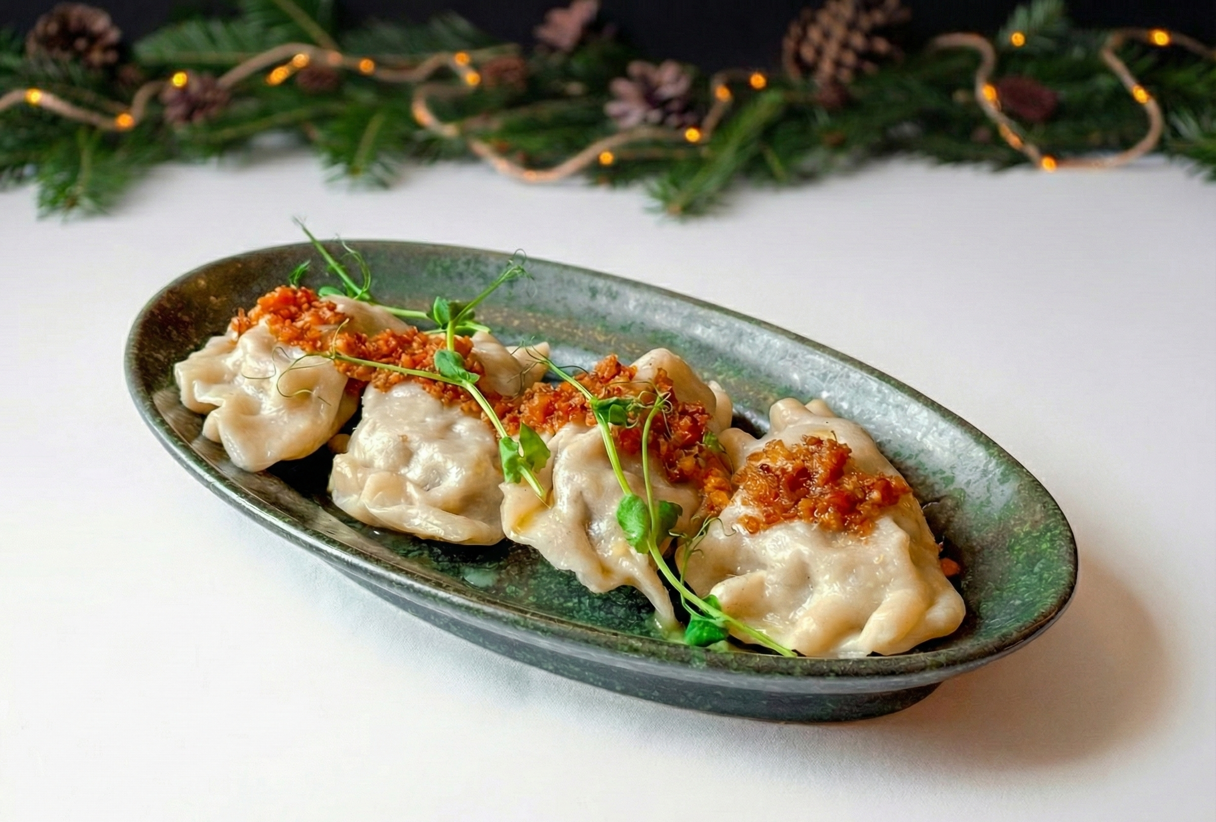 Pierogi z tradycyjnym farszem mięsnym, doprawione czosnkiem i majerankiem. Domowy smak, który zachwyca prostotą i głębią aromatu.